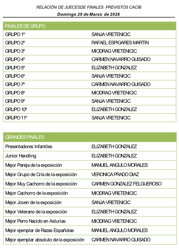 - Los ejemplares ganadores de Mejor de Raza en las clases Cachorros, Jóvenes, Intermedia, Trabajo, Abierta, Veteranos y Campeones, así como los ganadores de Grupo y Razas Españolas, deberán estar presentes en sus finales respectivas. De no hacerlo serán descalificados.